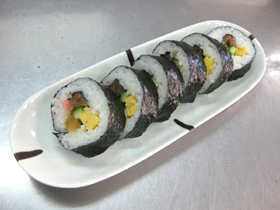 体にやさしい具がぎっしりと入ったボリューム満点の太巻きです。シーチキン巻、しいたけ巻、カニサラダ巻など多数ご用意しております。 |
