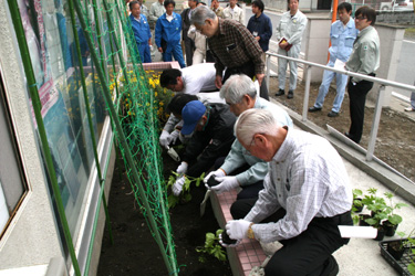 | 行田商工会議所工業部会では、管内企業の敷地内に、グリーンカーテン設置を行い、ゴーヤの苗を植え、緑化推進活動を企業間で推進しております。緑を増やすことにより地球温暖化防止など環境保全活動を拡げることを目的としており、日差しを遮る効果により、エアコン等の使用頻度が減り、節電効果も期待でき、最近の電力需要を抑えることにも効果的です。 |